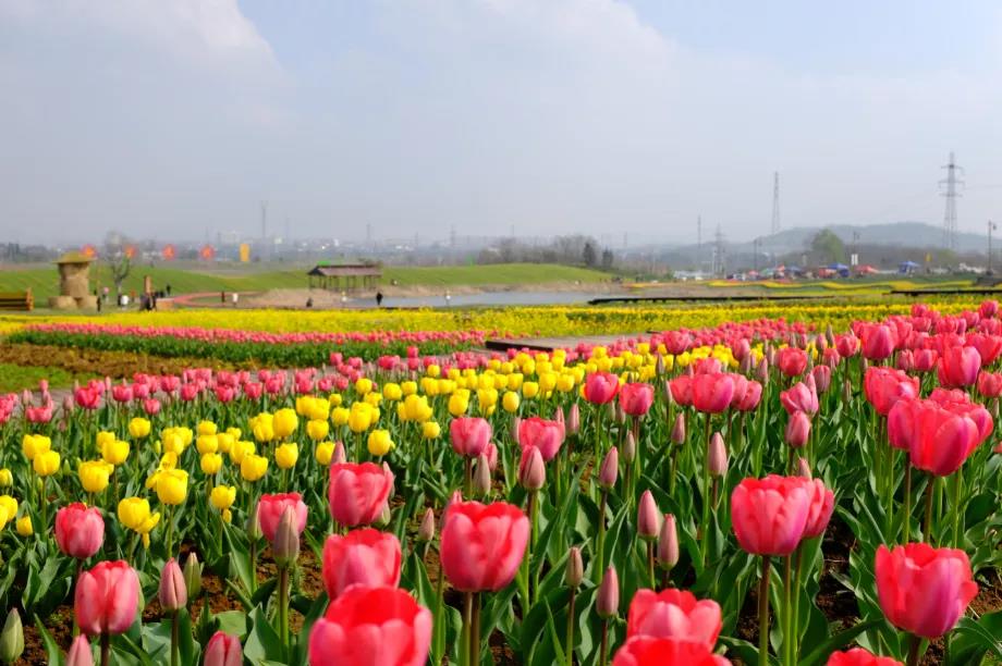 漫步於(yú)鬱金香(xiāng)花海之中